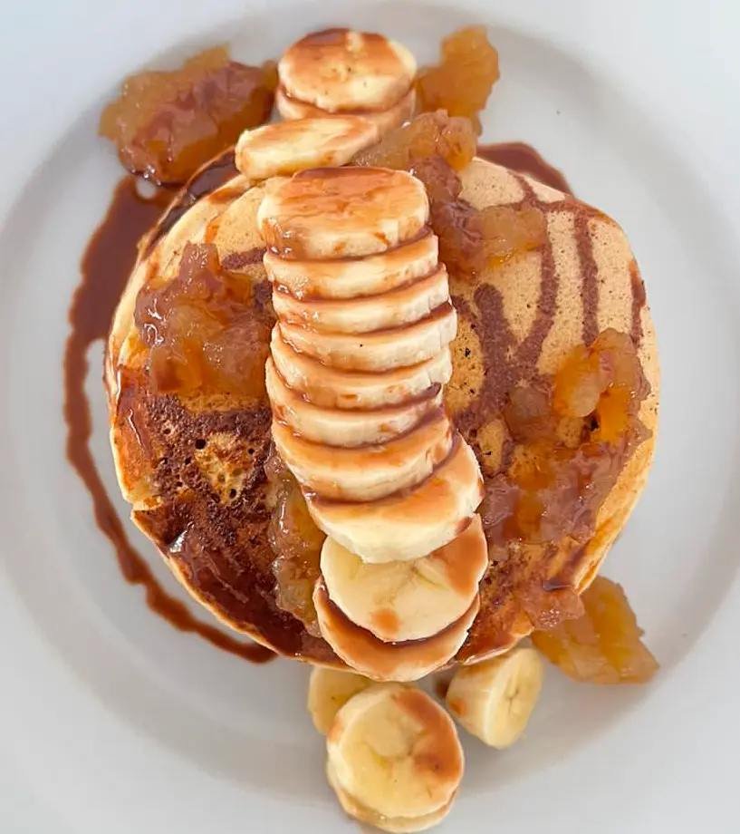 Pancakes caseros, con topping de banana, y salsa de nutella, rodeado con mermelada de manzana.
