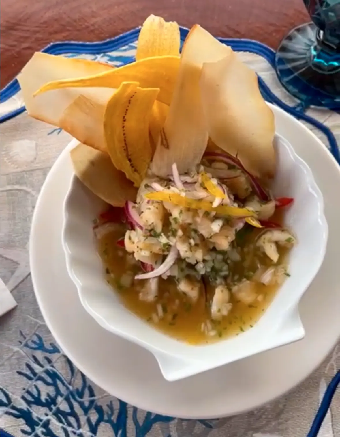 Ceviche de pesca del día, Bañado en leche de tigre de mango, cebolla morada, pimientos tricolor. acompañada de chips