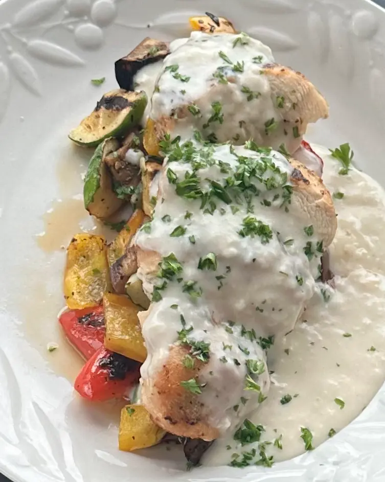Filete de pollo al grill con salsa mornay, mix de vegetales salteados y acompañamiento de su elección.