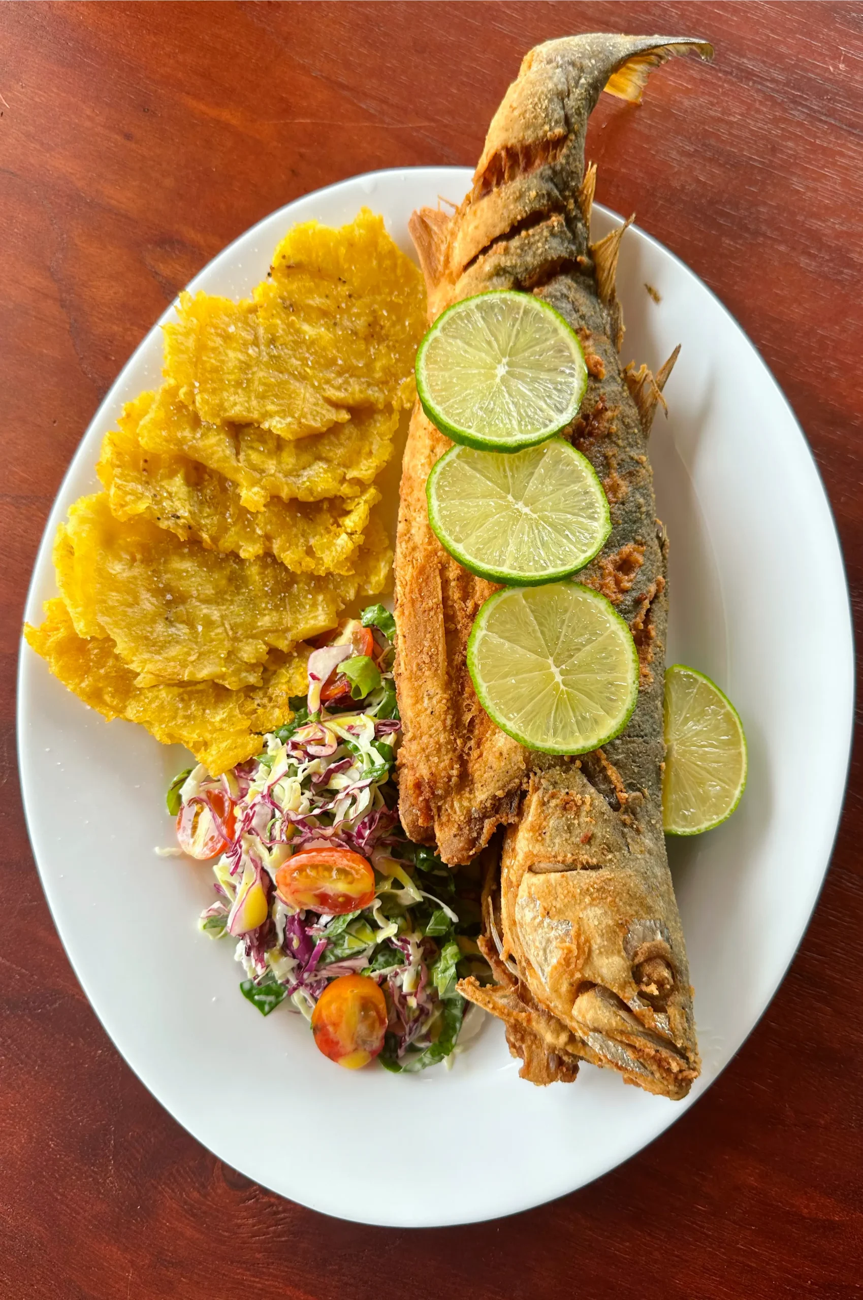 Filete de pescado en salsa menier, sobre plátanos, maduros bañados en chimichurri, ensalada de la casa.