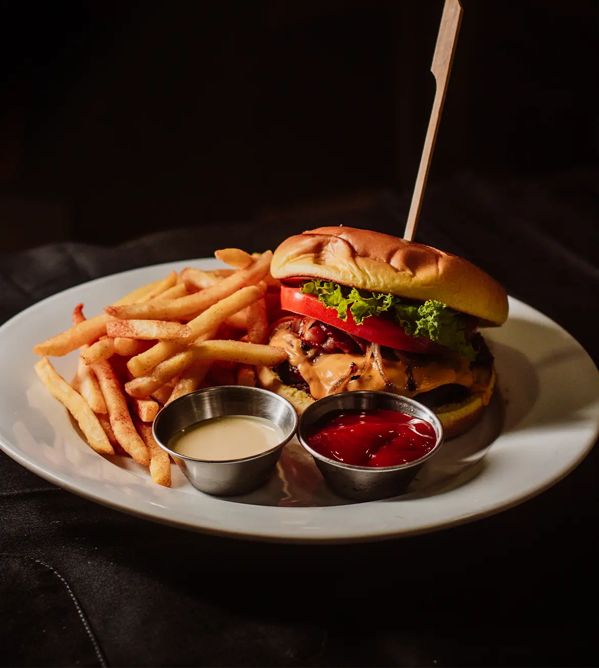 Con queso cheddar, cebollas caramelizadas, salsa bbq, pepinillos tomate y lechuga, acompañados de papa fritas en adobo casero.