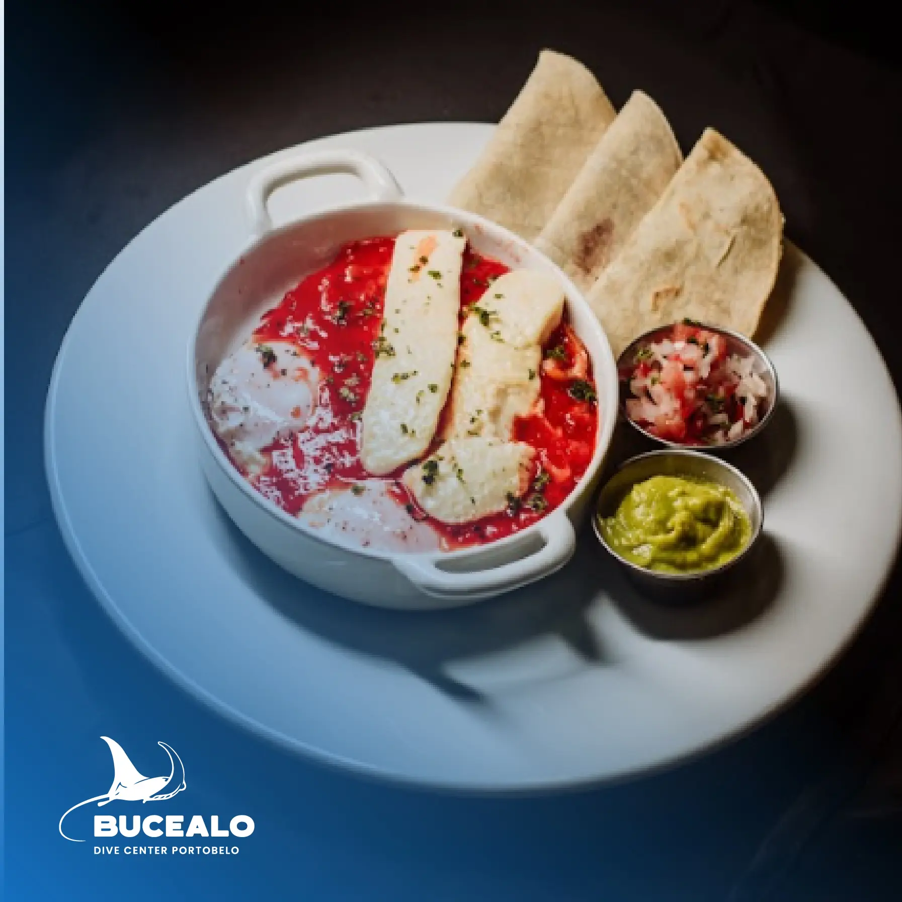 Huevos en salsa ranchera, queso asado, tortillasde maíz y frijoles refritos, acompañados de pico de gallo y guacamole.